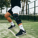 Knæbeskytteren er fremstillet i ventilerende og elastisk materiale med en anatomisk silikonkant, der hjælper med at centrere knæskallen. Indbyggede metalfjedre på begge sider bidrager til øget sidesstabilitet. Justerbare velcro-stropper gør det nemt at tilpasse pasformen selv under aktivitet.